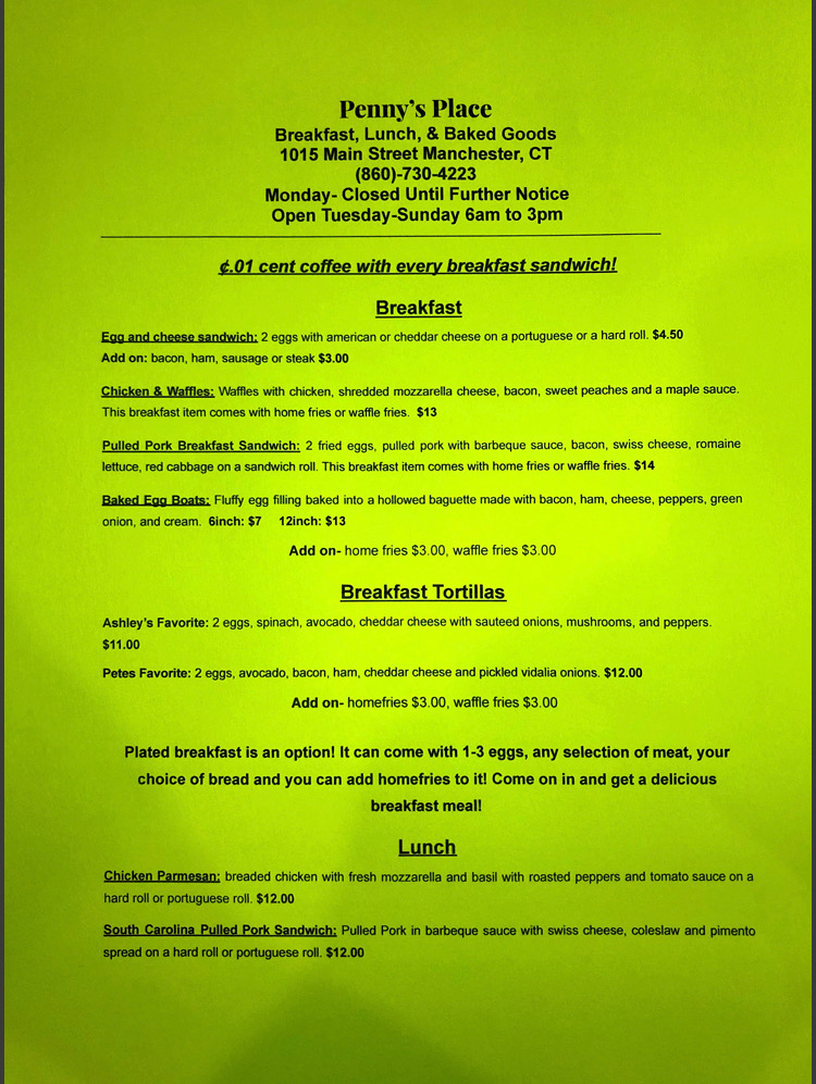 Welcome to Penny's Place, a hidden gem located at 1015 Main St, Manchester, CT. This cozy eatery offers an enticing menu that beautifully marries hearty comfort food with classic breakfast delights. Guests rave about the standout dishes, particularly the Apple Sausage Gouda Casserole, a rich and flavorful combination that keeps patrons coming back for more.
